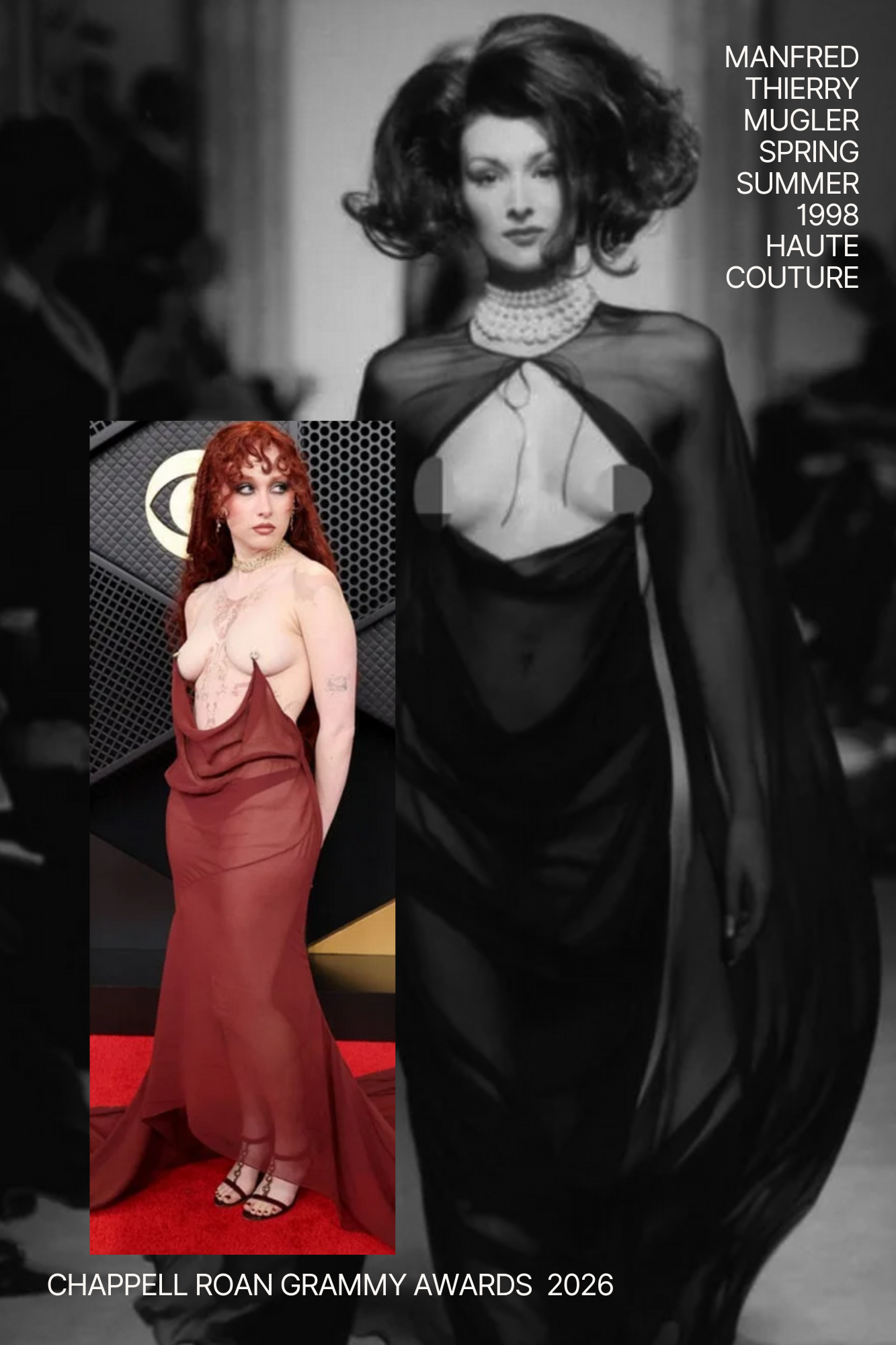 So Chappell Roan just caused quite the stir at the Grammys in that burgundy Mugler dress- you know, the one suspended from prosthetic nipple rings. The dress was a contemporary recreation of Thierry Mugler's Spring 1998 couture look, originally worn by Erica Vanbriel on the runway (WWD). And here's the thing: that 1998 collection is quintessentially Aquarius.